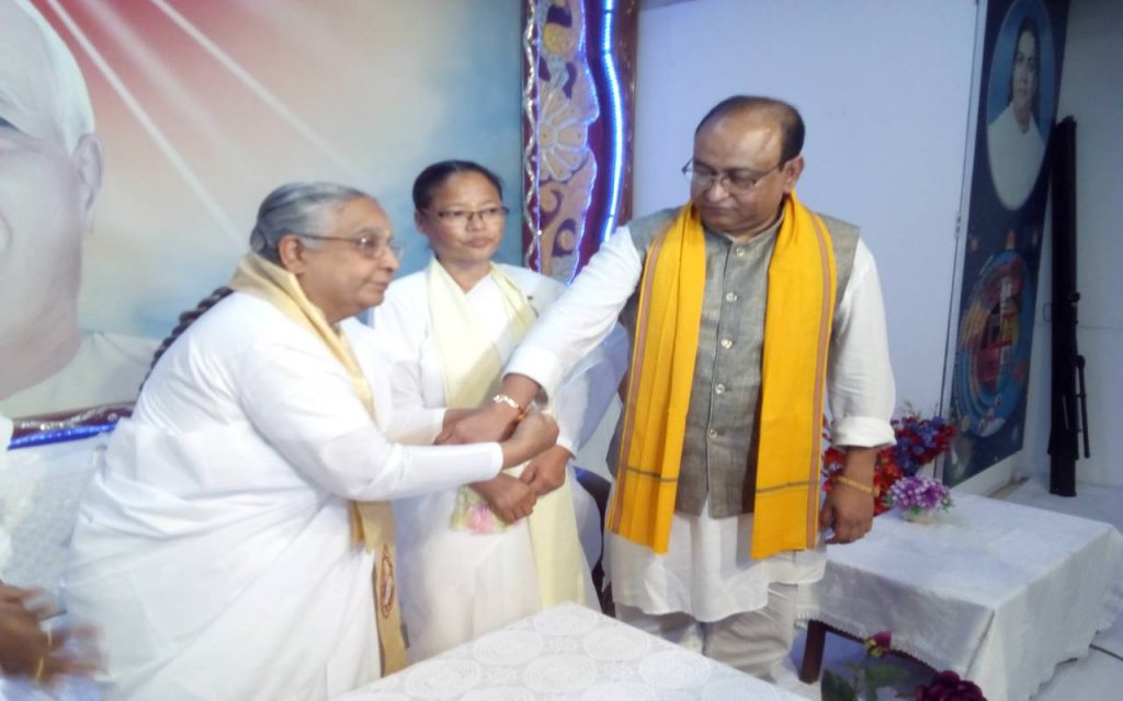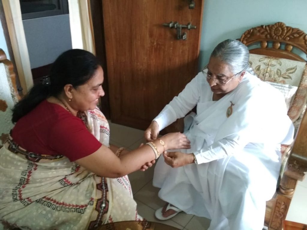 Respected Jayati Roy Chowdhury,Chairman,Pacific Pharmaciticals Ltd. being tide rakhi by B.K.Sheela Didiji, Sub-Zone incharge,North-East Region & Bangladesh,Brahma Kumaris World Spiritual University, Assam, India, in the Academy Auditorium in Dhaka.