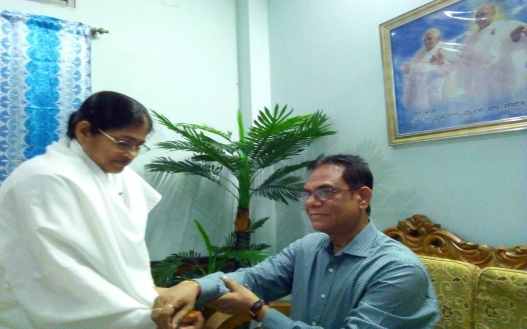 Respected Nasir Uddin Sathi,Chairman & M D, My tv, being tide rakhi by B.K.Sheela Didiji, Sub-Zone incharge,North-East Region & Bangladesh,Brahma Kumaris World Spiritual University, Assam, India, in the Academy Auditorium in Dhaka.